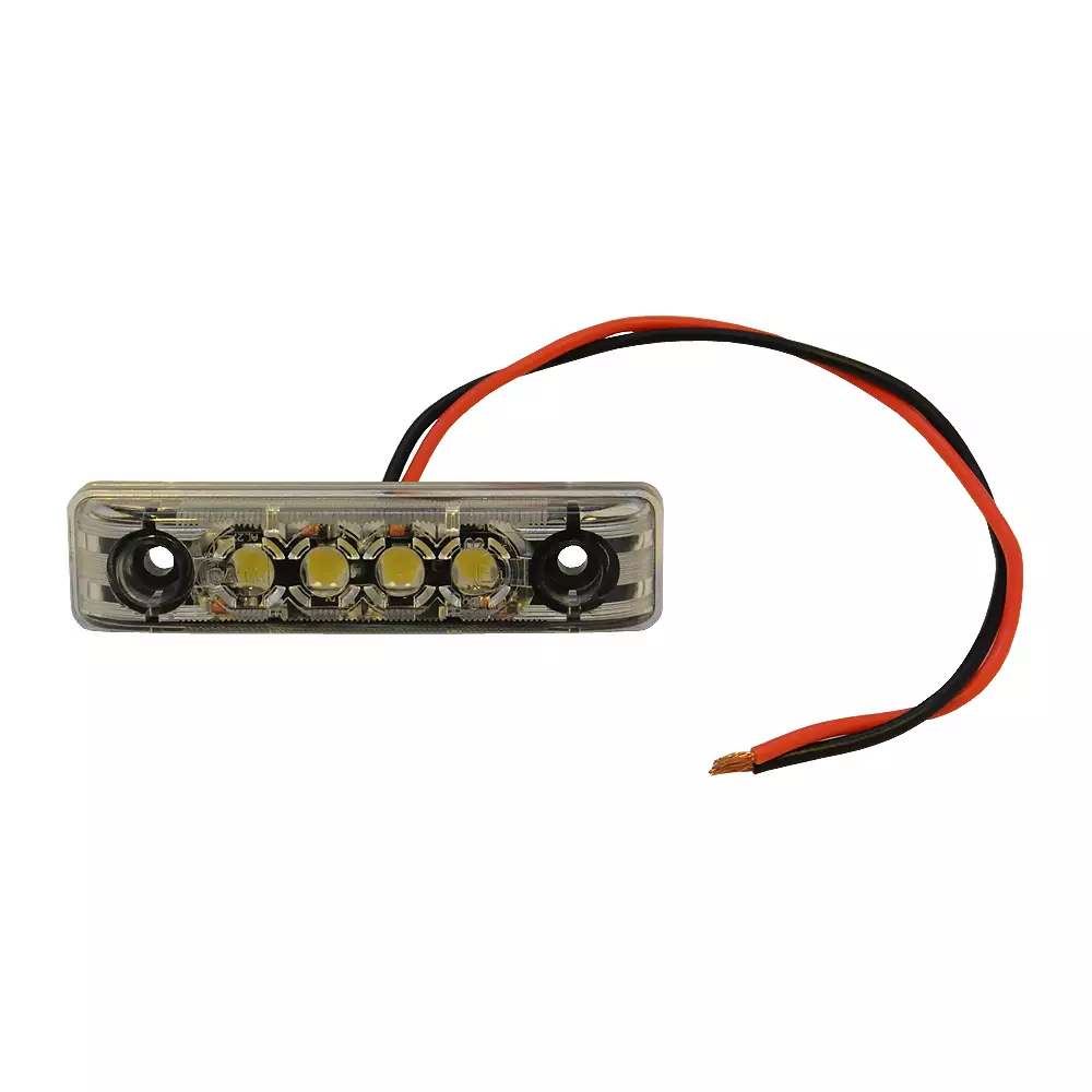 Led-äärivalo kirkas 4 lediä E- hyväksytty Mitat: 65x16x11mm Kiinnityslev: 45mm Asennusjohdot: n.165mm Jännite: 24V